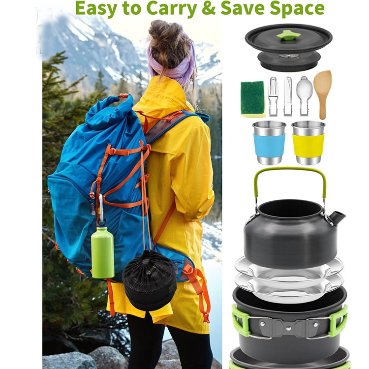 この包括的なキットには、鍋、フライパン、カップ、皿、フォーク、ナイフ、スプーンなど、屋外での食事に必要なものがすべて含まれており、キャンプの冒険に最適な完全なキッチン ソリューションを提供します。