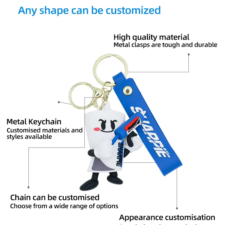 完全にカスタマイズされた 2D または 3D デザインで、ブランドやアイデアに命を吹き込みます。ロゴ、マスコット、スローガンなど、当社のソフト PVC キーチェーンは、鮮やかな色と高いディテールでお客様のビジョンに合わせてカスタマイズされます。