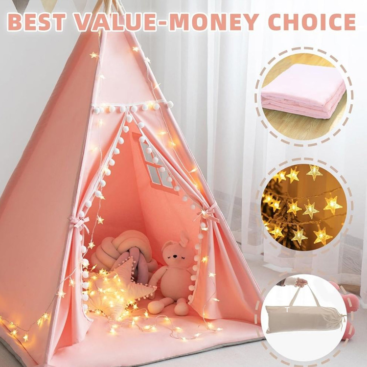 コットンキャンバスプレイハウス子供用ティーピーテント、マット付き子供用。創造的な冒険のための究極の魔法のプレイスペース。このコットンキャンバス製ティピーテントには、快適なマット、魅惑的なスターライト、便利なキャリーケースが含まれています。想像力豊かな遊びを刺激し、子供時代の永続的な思い出を作るのに最適です。