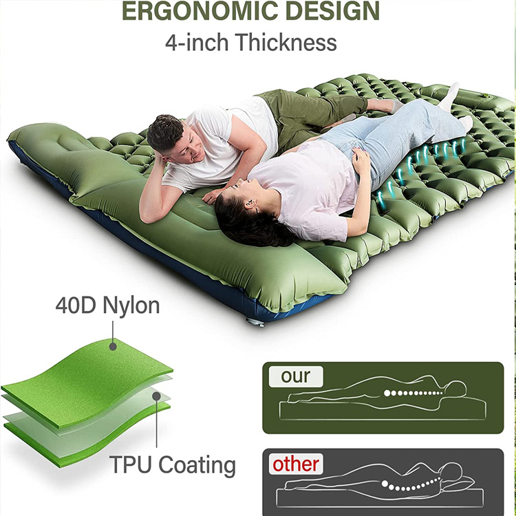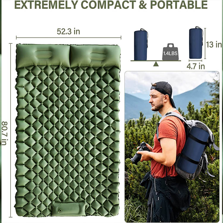 二人用キャンプスリーピングパッドインフレータブルキャンプパッド。アウトドアアドベンチャーのための究極のダブル快適。このインフレータブル2人用キャンプパッドは、滑りを防ぐ革新的な足拘束デザインで広々とした睡眠スペースを提供します。超軽量ソリューションとして、キャンプのカップルや友人に比類のない携帯性と共有の快適さを提供します。