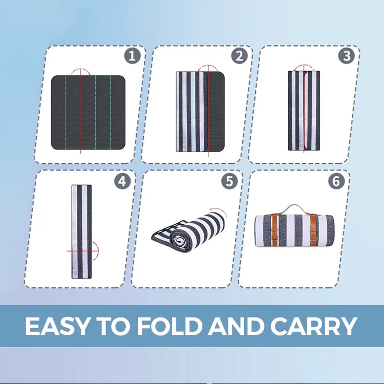 折りたたみストライプの耐久性のある防水ピクニック マット ブランケット。ピクニックや冒険のための最高のアウトドア コンパニオンです。この工場直送のピクニックマットは、便利なキャリーハンドル付きのコンパクトな折りたたみデザインが特徴です。ストライプの耐久性のある防水生地で作られており、卸売クライアント向けにカスタム印刷オプションを提供しています。