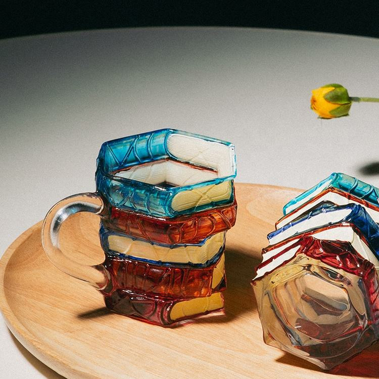 手描きのガラスコーヒーカップ 3D ペイントブックコーヒーマグ。ユニークな 3D スタックブックデザインを特徴とする手描きのブックガラスコーヒーカップは、本愛好家やコーヒー愛好家に最適です。鮮やかな色の耐久性のあるガラス構造で、ご自宅やオフィスのギフトや装飾品に最適です。